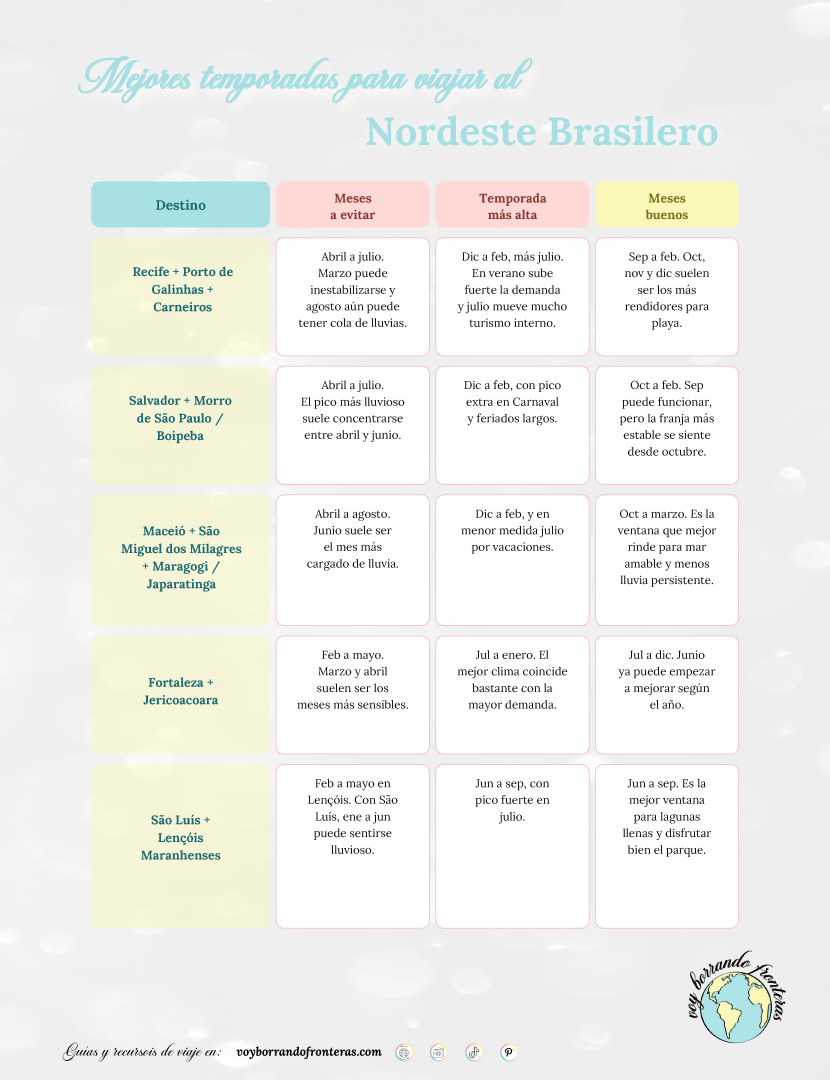 Las mejores ventanas suelen ser cuando evitás feriados muy fuertes y picos de verano brasileño, porque suben los precios y la ocupación. Eso se ve clarísimo en Bahía, Ceará y Pernambuco durante las temporadas de alta demanda. De hecho te cuento como chismecito que al alquilar un dpto por larga estancia nos pasó que me aumentaron el valor porque en ese mes había un feriado local.